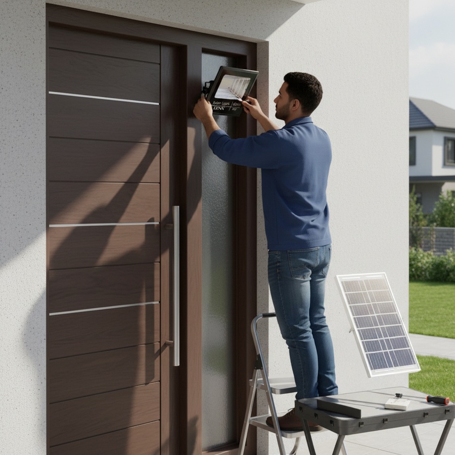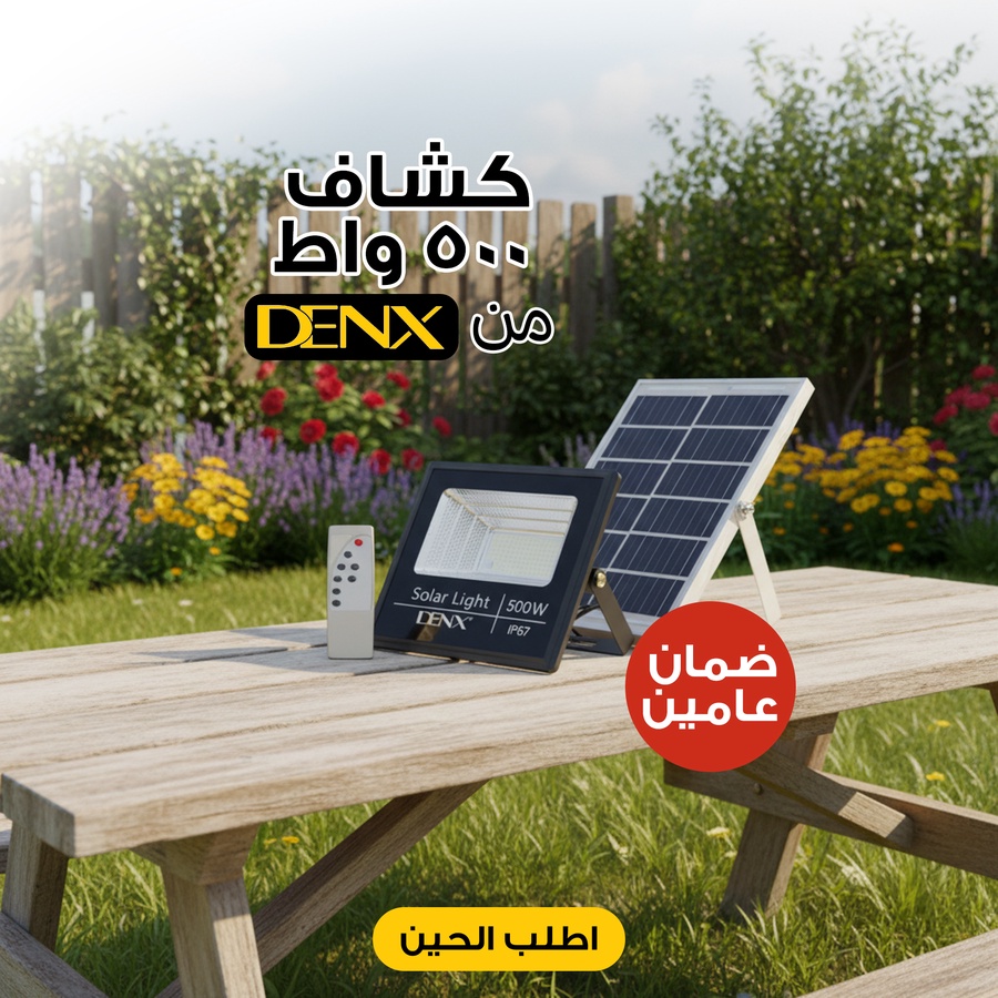 إضاءة قوية 500 واط، مقاوم للمطر والغبار، يعمل بالطاقة الشمسية ويوفر كهرباء، مع حساس تلقائي للتشغيل والإيقاف.