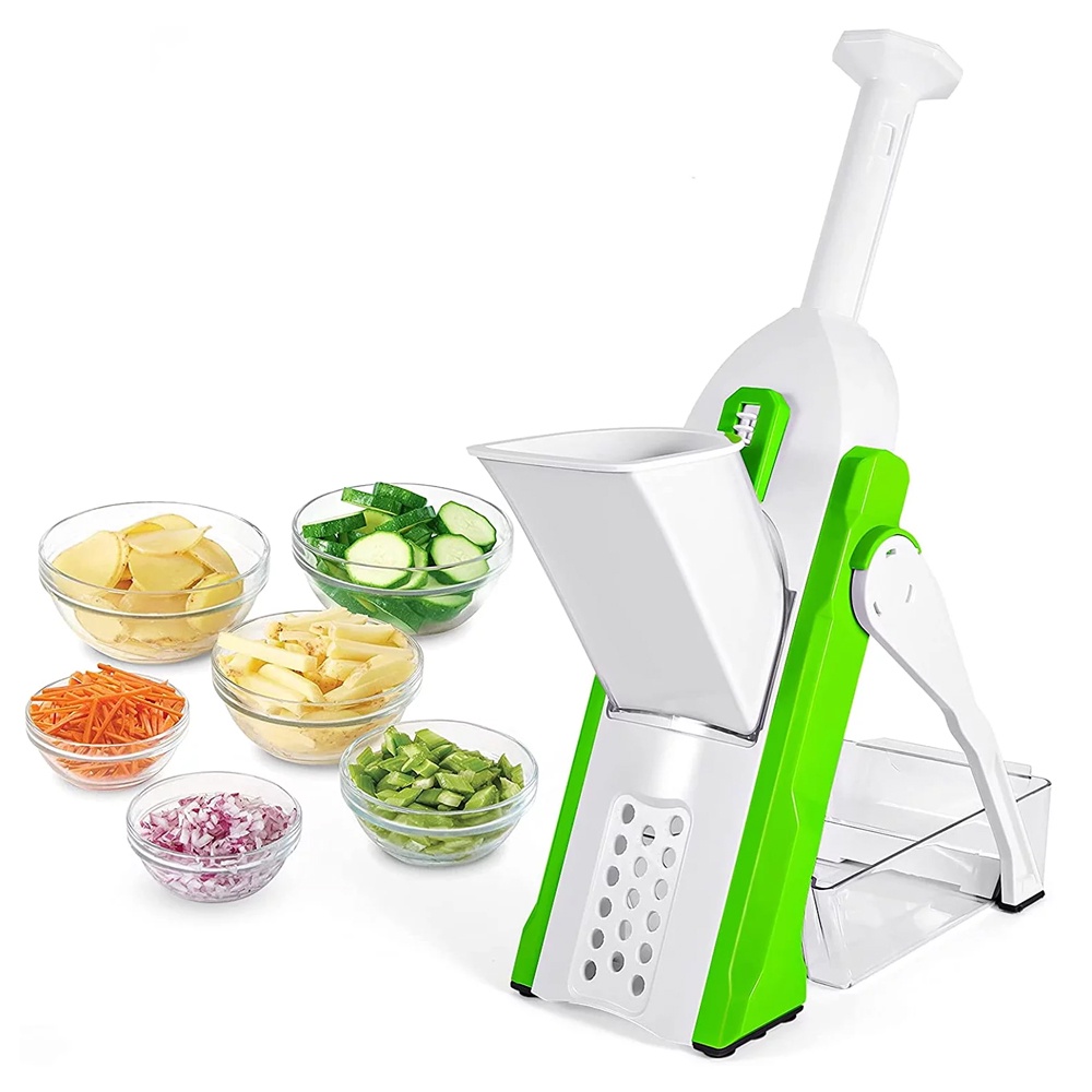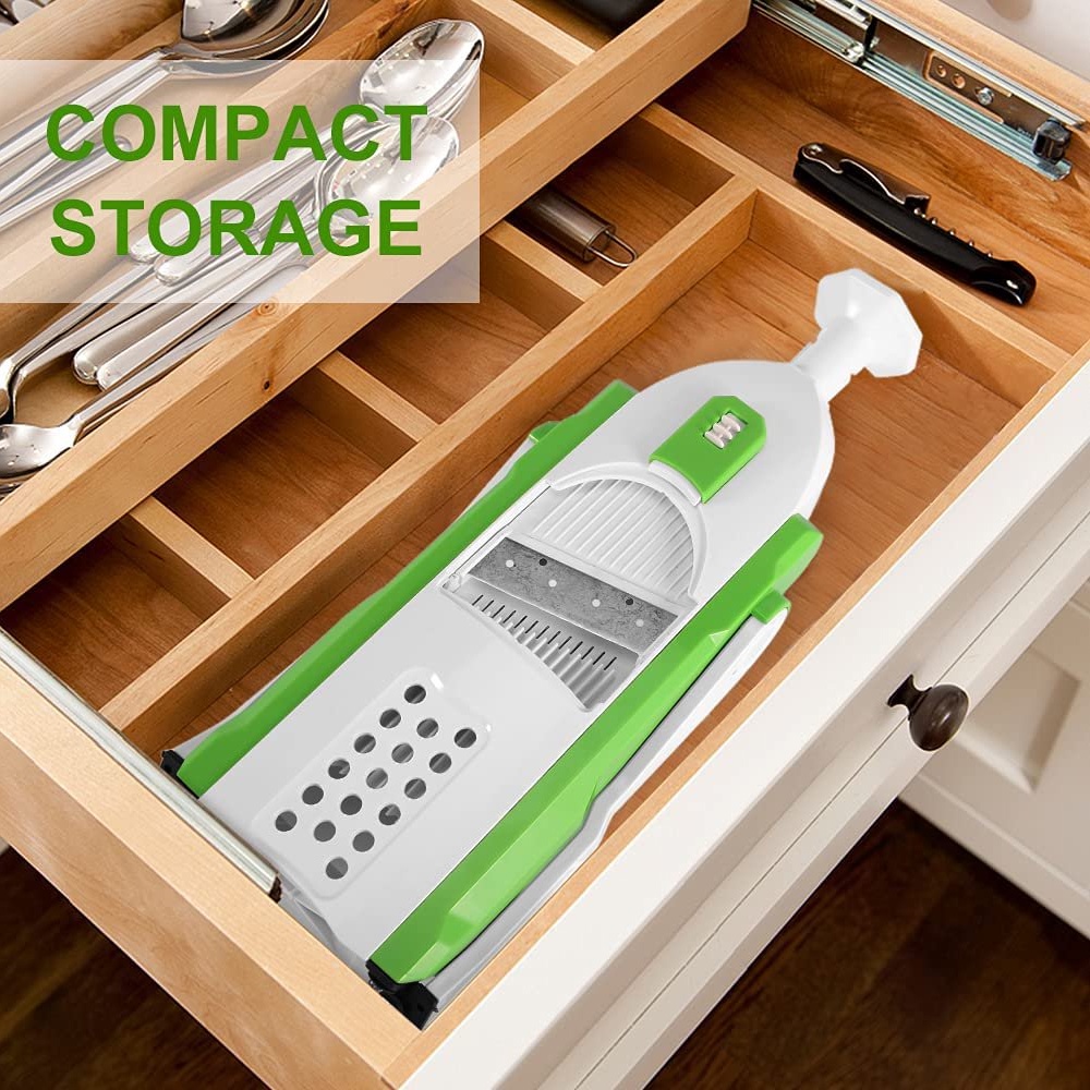 قطاعة خضار يدوية 4 في 1 بشفرات ستانلس ستيل حادة، تصميم قابل للطي، آمنة وسهلة الاستخدام لتقطيع الفواكه والخضروات بأحجام مختلفة.